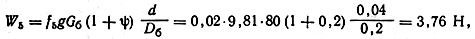 здесь q = 0,244 — погонная масса каната, кг/м; t = 2 с — время разбега сетки; сопротивление в подшипниках барабана лебедки здесь f5 = 0,2 — коэффициент сопротивления в подшипниках барабана;