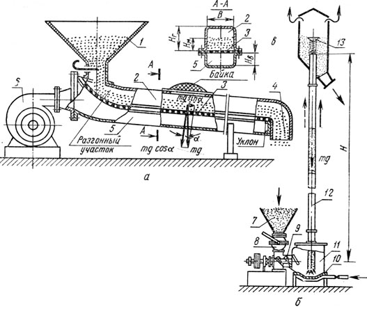 Рис. 84. Аэрожелоб (а) и пневматический подъемник (б): 1 — загрузочное устройство; 2 — грузовой канал; 3 — перегородка; 4 — разгрузочное окно; 5 — воздушный канал; 6 — вентилятор; 7 — загрузочный бункер; 8 — регулировочное устройство; 9 — питатель; 10 — пористое дно; 11 — смесительная камера; 12 — трубопровод; 13 — разделитель.